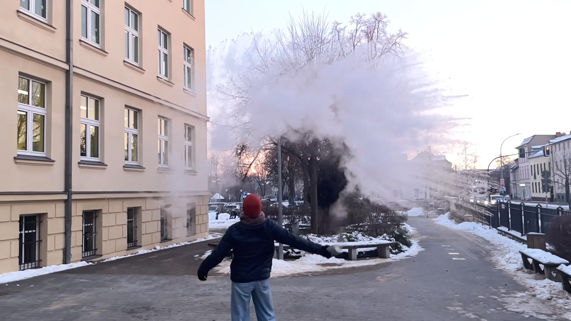 Im Physikunterricht erprobte eine Schülerin den Mpemba-Effekt: Heißes Wasser kann unter bestimmten Bedingungen schneller gefrieren als kaltes. Bei winterlichen Temperaturen warf sie heißes Wasser in die Luft, wo es sich sofort in feine Eiskristalle verwandelte. Der Versuch zeigt anschaulich, wie Verdunstung, Wärmeübertragung und Umgebungseinflüsse zusammenwirken